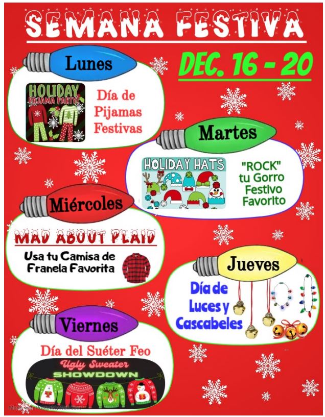 Don't forget! We are having a holiday themed spirit week all week. It was so great seeing everyone in their cozy pajamas today. The remaining spirit days are listed below. (see attached)