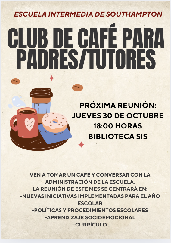 Just a friendly reminder that this upcoming Thursday, October 30th, SIS administration will be hosting a parent coffee club from 6-7pm in the library. Please see the attached flyer for more information. Child care will be available for anyone who wants to bring their children. There is also going to be a Halloween Dance in the cafeteria starting at 6:00pm for all students in grades 5-8.